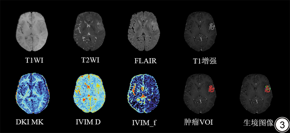 在当前临床实践中,IDH突变状态通常需要通过术后肿瘤组织的基因测序进行确认,该过程耗时且费用较高[9]。磁共振成像(magnetic resonance imaging, MRI)是胶质瘤术前诊断的核心工具,能够提供丰富的解剖学信息并潜在反映肿瘤微环境中的基因特征[10]。扩散加权成像(diffusion weighted imaging, DWI)作为一种灵敏、无创的技术方法,能够反映组织内细胞、血管及微结构的改变[11]。传统高斯分布的DWI参数表观扩散系数(apparent diffusion coefficient, ADC)可反映组织内的细胞密度。各种非高斯分布DWI模型可反映不同的组织学特征,如体素内不相干运动模型(intravoxel incoherent motion, IVIM)的参数灌注分数(f)可反映组织微循环灌注,扩散系数(D)可反映组织内的细胞密度,扩散峰度成像(diffusion kurtosis imaging, DKI)的参数平均峰度(mean kurtosis, MK)可反映组织异质性[12, 13, 14]