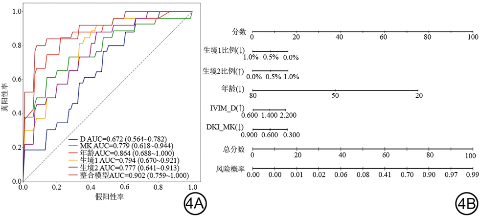 图4  各模型的ROC曲线(4A)和整合模型的列线图(4B)。ROC:受试者工作特征;AUC:曲线下面积;IVIM:体素内不相干运动模型;D:真实扩散系数;DKI:扩散峰度成像;MK:平均扩散峰度。
