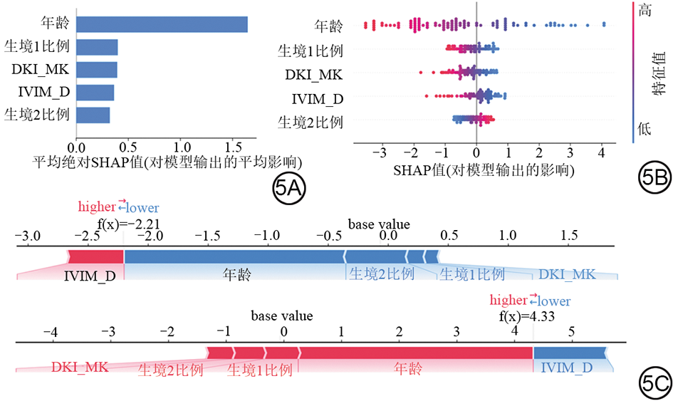 图5  SHAP分析结果。5A:整合模型中各参数SHAP值的绝对值;5B:整合模型中各参数SHAP值的原始数值;5C:整合模型中各特征对IDH鉴别任务的贡献展示。SHAP:夏普利加性解释;IDH:异柠檬酸脱氢酶;IVIM:体素内不相干运动模型;D:真实扩散系数;DKI:扩散峰度成像;MK:平均扩散峰度。