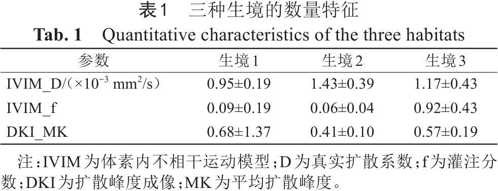 99例成人弥漫性胶质瘤患者中,IDH野生型73例,年龄(63.07±10.54)岁,IDH突变型26例,年龄(41.82±11.23)岁。IDH野生型患者年龄高于IDH突变型(P<0.001),二者性别分布差异无统计学意义(P=0.532)。IDH野生型患者的生境1比例高于IDH突变型,生境2比例低于IDH突变型(均P<0.001),两组生境3的比例差异无统计学意义(P=0.627)。IDH野生型患者IVIM参数D小于IDH突变型(P=0.007),DKI参数MK大于IDH突变型(P<0.001),IVIM参数f差异无统计学意义(P=0.106)(表2)。