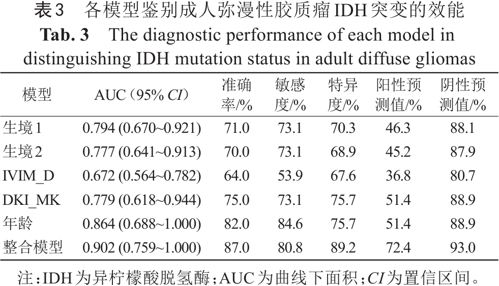表3  各模型鉴别成人弥漫性胶质瘤IDH突变的效能