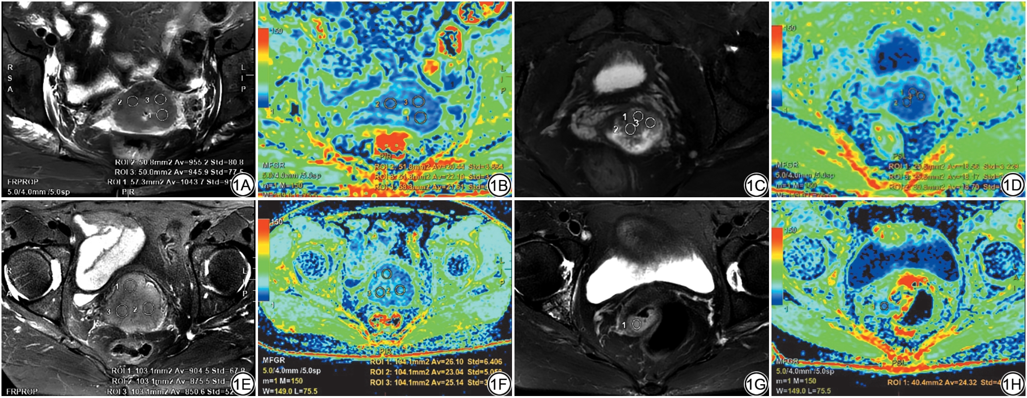 Fig. 1  Comparison of R2*post values in cervical squamous cell carcinoma patients with different prognostic risks. 1A-1D: Female, 51 years old, with postoperative pathological risk factors. The R2*post value was 18.48 Hz, below the optimal cutoff (21.68 Hz). 1E-1H: Female, 53 years old, without postoperative pathological risk factors. The R2*post value was 24.32 Hz, above the optimal cutoff (21.68 Hz). Axial post-NACT images show a reduction in the maximum tumor diameter in both patients, despite the difference in R2*post values, suggesting the potential utility of R2*post in assessing the risk of prognostic factors after NACT. 1A, 1C, 1E, 1G: Axial fat-suppressed T2-weighted images (FS-T2WI) at the maximum tumor cross-section before and after NACT. 1B, 1D, 1F, 1H: Corresponding R2* pseudocolor maps from BOLD-MRI, red represents high R2* values, and blue represents low R2* values. R2*: effective transverse relaxation rate; R2*post: post-NACT R2*; NACT: neoadjuvant chemotherapy; FS-T2WI: fat-suppressed T2-weighted imaging; BOLD-MRI: blood oxygen level dependent magnetic resonance imaging.