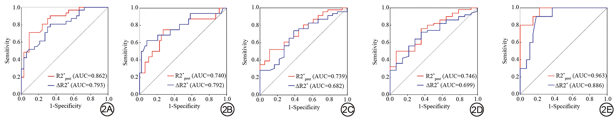 Fig. 2  Receiver operating characteristic (ROC) curves of R2*post and ∆R2* for predicting LVSI (2A), LNM (2B), depth of stromal invasion (2C), prognostic risk factors (2D), and response to NACT (2E). R2*: effective transverse relaxation rate; LVSI: lymphovascular space invasion; LNM: lymph node metastasis; NACT: neoadjuvant chemotherapy; AUC: area under the curve.