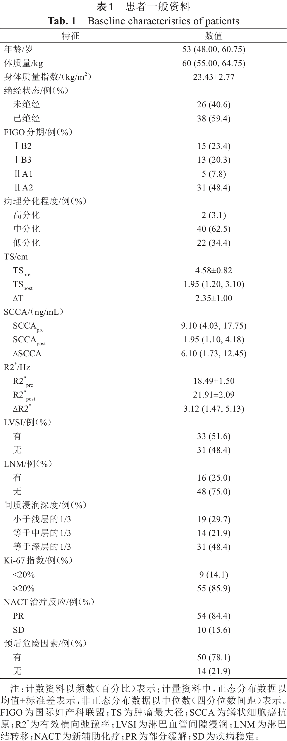 本研究共纳入64例宫颈鳞癌患者病例,年龄53(48.00,60.75)岁,范围为33~66岁,患者一般资料详见表1。NACT后54例(84.4%)评估为PR,10例(15.6%)评估为SD。