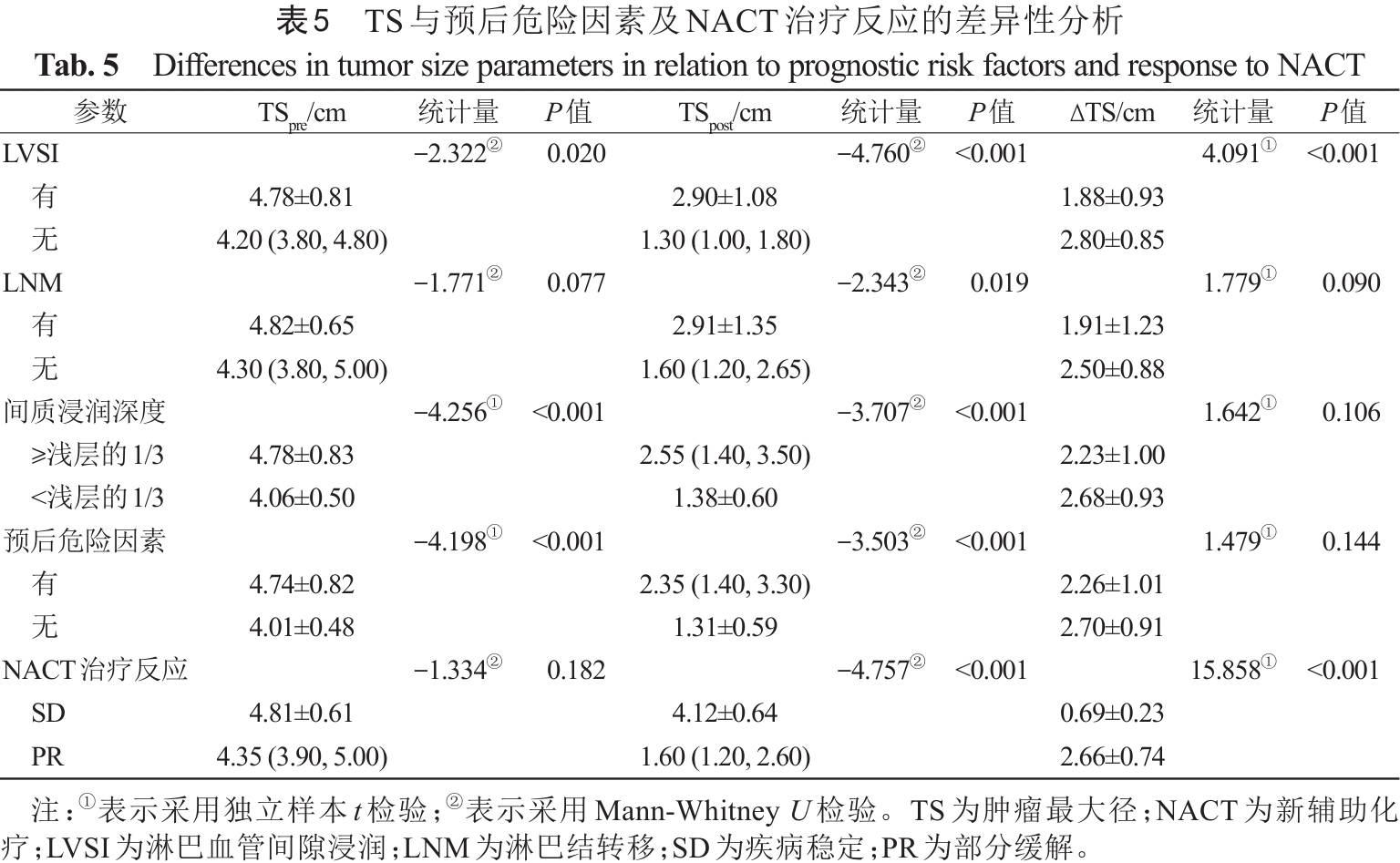 Tab. 5  Differences in tumor size parameters in relation to prognostic risk factors and response to NACT