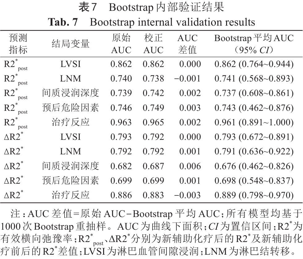 本研究采用IBM SPSS 27.0、GraphPad Prism 10.1.2、R 4.5.0软件进行统计学分析及绘图。计量资料经Shapiro-Wilk检验进行正态性分析,符合正态分布者以(x¯±s)表示,差异比较采用独立样本t检验;非正态分布者以MP25,P75)表示,差异比较采用Mann-Whitney U检验。计数资料以频数(百分比)表示。Pearson或Spearman相关分析用于评估R2*参数与肿瘤组织病理学特征及NACT反应的相关性,对差异性分析中差异有统计学意义的R2*参数及临床常规评价所依据的肿瘤直径参数进行单因素二元logistic回归分析,将单因素分析中具有统计学意义(P<0.05)的变量,基于效应量(OR值)大小、临床决策时间点及其生物学意义筛选,通过多重共线性检验(方差膨胀因子<5)后,进行logistic回归(向前法)多因素分析。通过绘制受试者工作特征(receiver operating characteristic, ROC)曲线评估R2*参数的预测效能,计算曲线下面积(area under the curve, AUC),并依据最大约登指数确定评估良好治疗反应的最佳临界值。P<0.05为差异具有统计学意义。此外,为进一步验证R2*参数的预测性能,本研究采用Bootstrap自助抽样法进行内部验证。