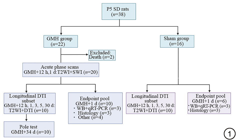 选择5日龄SP级Sprague-Dawley(SD)大鼠38只,体质量9~12 g(北京维通利华实验动物技术有限公司)。所有大鼠雌雄各半,在此基础上随机分为GMH组(n=22)与对照组(n=16),雌雄各半。GMH模型构建过程中共排除死亡及建模后未见明显出血的大鼠2只。实验设计结合纵向影像与终点分析(图1)。