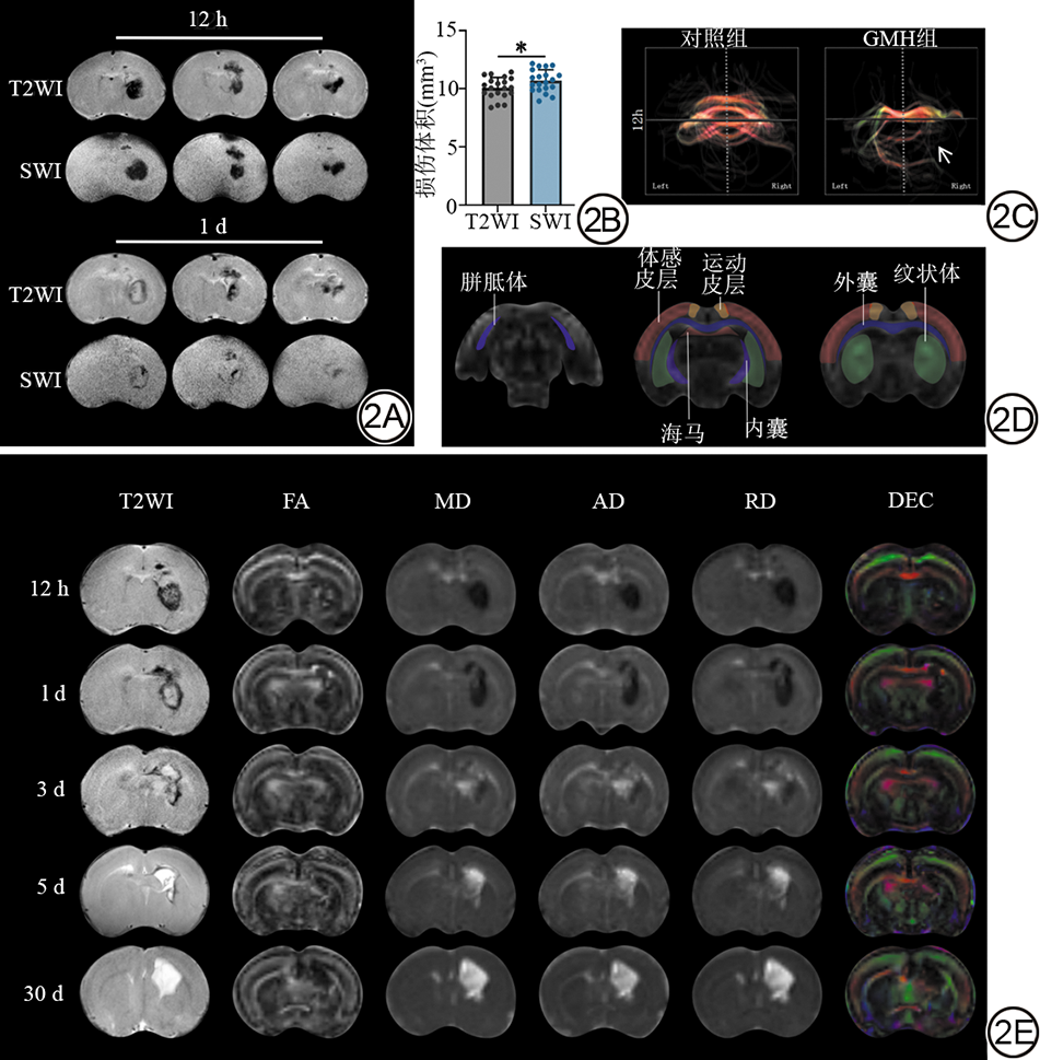图2  GMH后早期影像学特征、ROI定位及损伤演变。2A:GMH后12 h及1 d冠状位T2WI及SWI图像示血肿信号演变。2B:GMH后12 h基于T2WI与SWI测量的病灶体积统计(n=20)。2C:GMH后1 d纹状体区白质纤维束三维重建示意图。2D:代表性大脑ROI示意图。2E:GMH后不同时间点T2WI与DTI参数FA、MD、AD、RD和DEC的图像变化趋势。*:P<0.05。GMH:生发基质出血;ROI:感兴趣区;T2WI:T2加权成像;SWI:磁敏感加权成像;DTI:扩散张量成像;FA:各向异性分数;MD:平均扩散率;AD:轴向扩散率;RD:径向扩散率;DEC:方向编码彩色图。