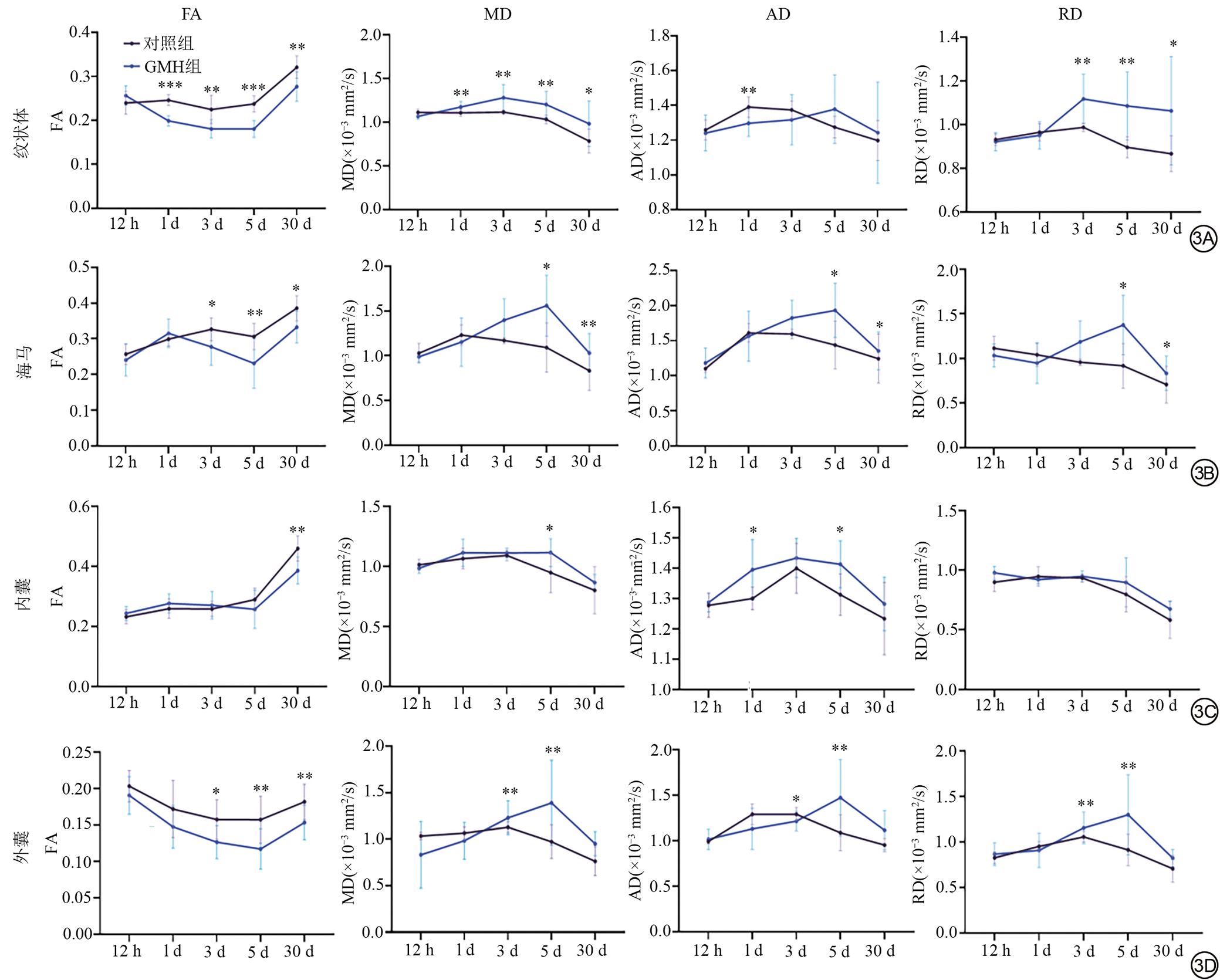 图3  损伤核心及邻近脑区白质DTI参数的动态演变。于GMH后12 h、1、3、5及30 d,分别检测双侧纹状体(3A)、海马(3B)、内囊(3C)、外囊(3D)四个脑区的FA、MD、AD和RD数值(n = 10)。*:P<0.05;**:P<0.01;***:P<0.001。DTI:扩散张量成像;GMH:生发基质出血;FA:各向异性分数;MD:平均扩散率;AD:轴向扩散率;RD:径向扩散率。