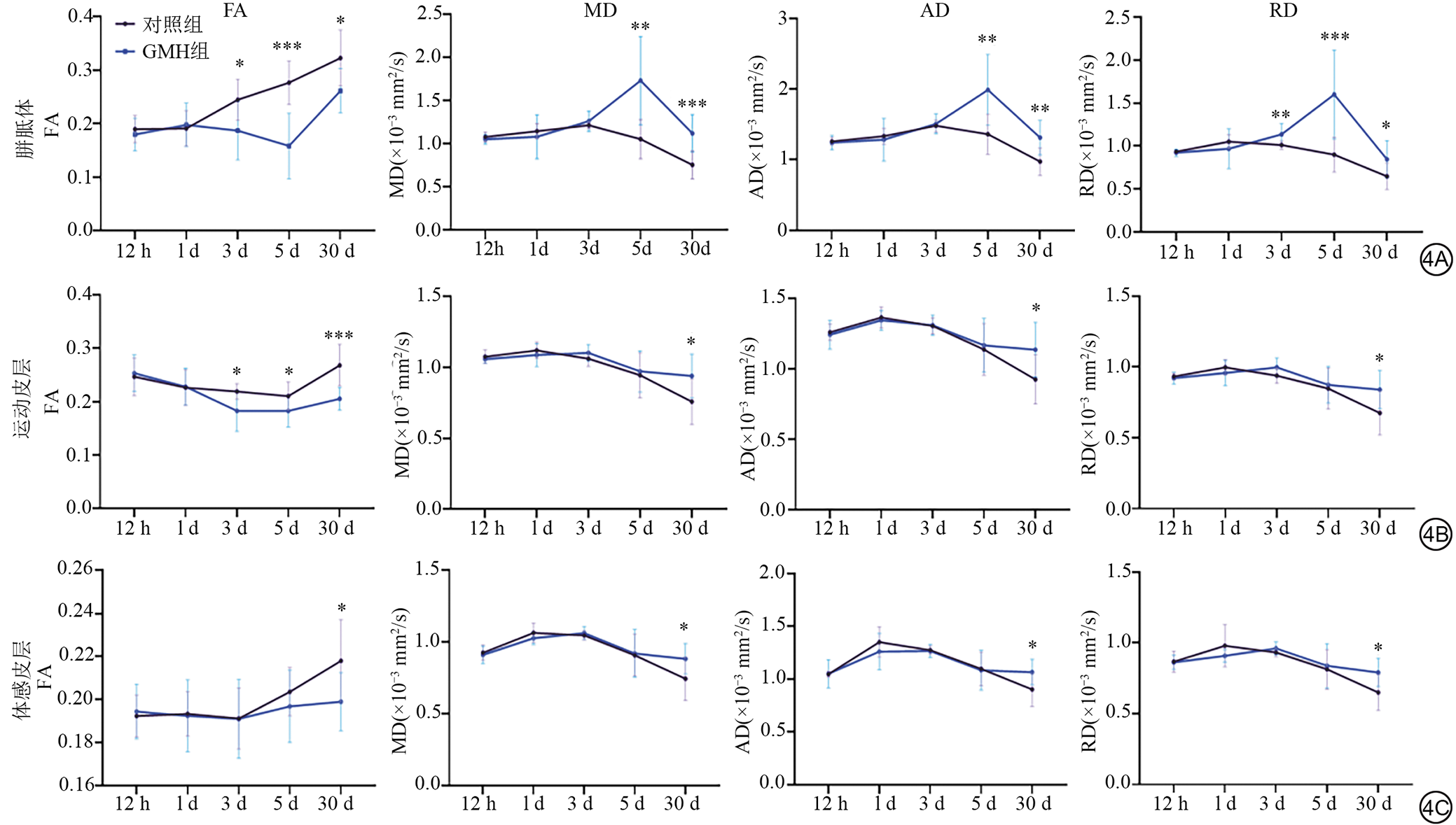 图4  损伤远隔脑区白质DTI参数的动态演变。于GMH后12 h、1、3、5及30 d,分别检测双侧胼胝体(4A)、运动皮层(4B)、体感皮层(4C)三个脑区的FA、MD、AD和RD数值(n = 10)。*:P<0.05,**;P<0.01;***:P<0.001。DTI:扩散张量成像;GMH:生发基质出血;FA:各向异性分数;MD:平均扩散率;AD:轴向扩散率;RD:径向扩散率。