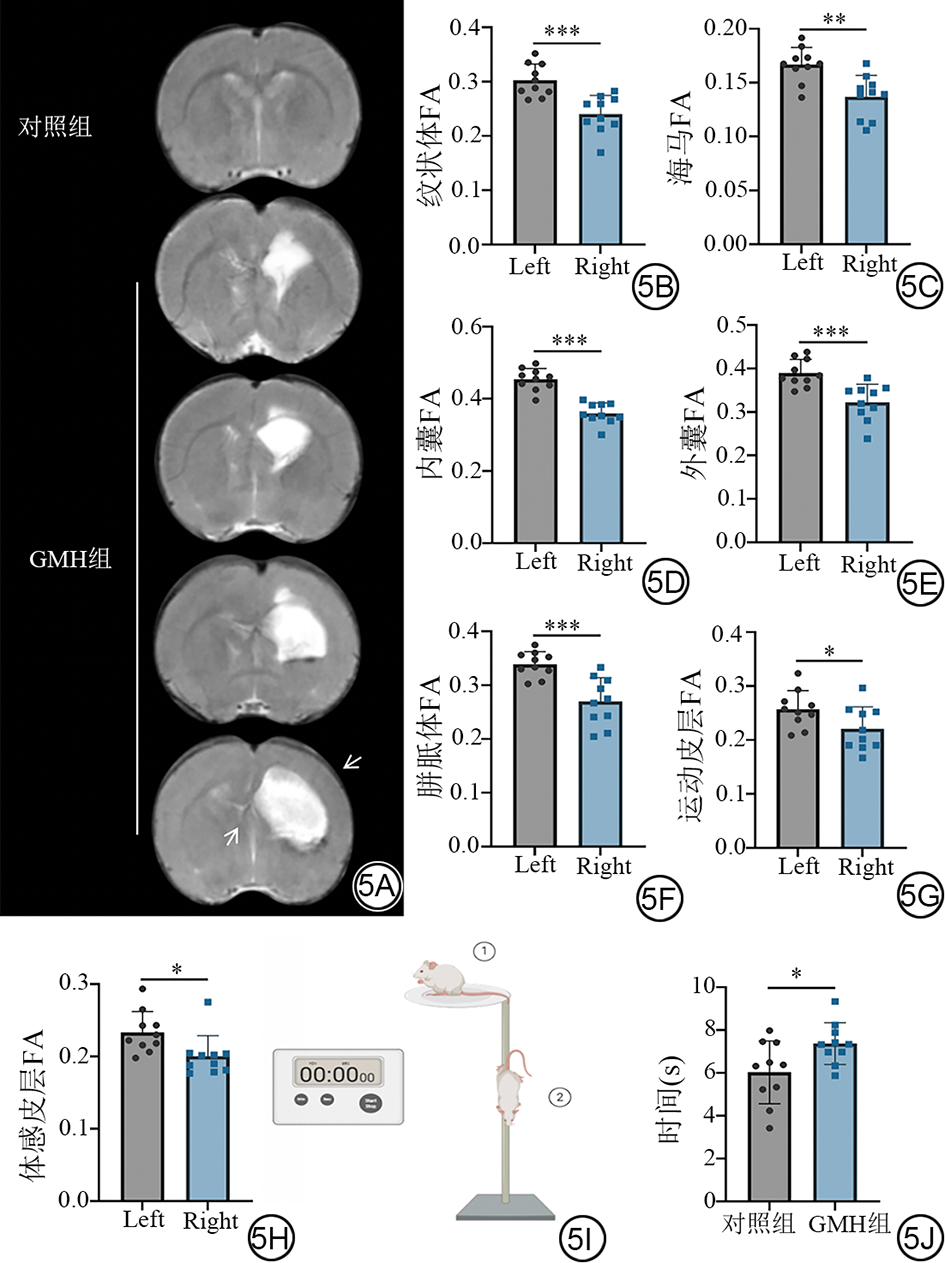 图5  GMH远期白质结构偏侧性改变与运动功能。5A:GMH后30 d,代表性T2WI示损伤侧脑室扩张。5B~5H:同期GMH大鼠左侧与右侧纹状体(5B)、海马(5C)、内囊(5D)、外囊(5E)、胼胝体(5F)、运动皮层(5G)及体感皮层(5H)七个脑区的FA、MD、AD和RD数值的差异(n=10)。5I:爬杆实验示意图。5J:GMH组大鼠爬杆耗时较对照组延长(n=10)。*:P<0.05;**:P<0.01;***:P<0.001。GMH:生发基质出血;T2WI:T2加权成像;FA:各向异性分数;MD:平均扩散率;AD:轴向扩散率;RD:径向扩散率。