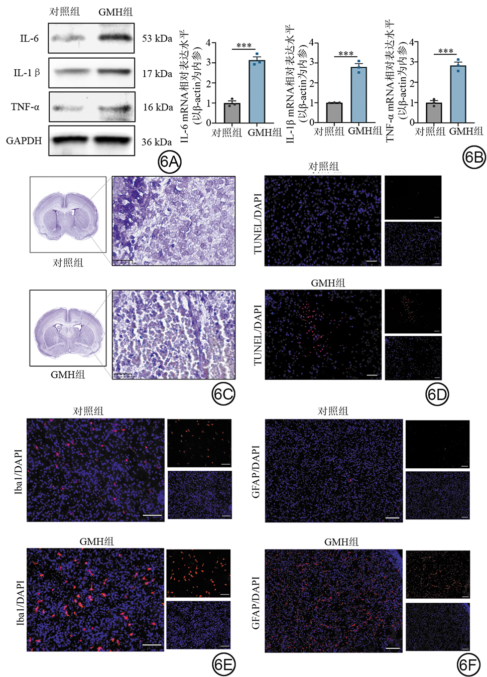 Fig. 6  GMH-induced neuroinflammation and apoptosis at 1 d post-GMH in neonatal rats. 6A: Representative Western blots of striatal inflammatory factors IL-6, IL-1β and TNF-α. 6B: Quantitative analysis of IL-6, IL-1β, and TNF-α mRNA levels. Values were normalized to β-actin(n = 3). 6C: Representative micrographs of Nissl staining in the striatum of control and GMH groups (scale bar: 50 μm) (n = 3). 6D: Representative fluorescence staining of TUNEL (red) and DAPI (blue) in the striatum (scale bar: 50 μm) (n = 3). 6E: Representative fluorescence staining of DAPI (blue) and Iba1 (red) in the striatum (scale bar: 100 μm) (n = 3). 6F: Representative fluorescence staining of DAPI (blue) and GFAP (green) in the striatum (scale bar: 100 μm) (n = 3). ***: P < 0.001. GMH: germinal matrix hemorrhage; IL-6: interleukin-6; IL-1β: interleukin-1 beta; TNF-α: tumor necrosis factor-alpha; WB: Western blot; β-actin: beta-actin; TUNEL: terminal deoxynucleotidyl transferase dUTP nick-end labeling; DAPI: 4′, 6-diamidino-2-phenylindole; Iba1: ionized calcium-binding adapter molecule 1; GFAP: glial fibrillary acidic protein.
