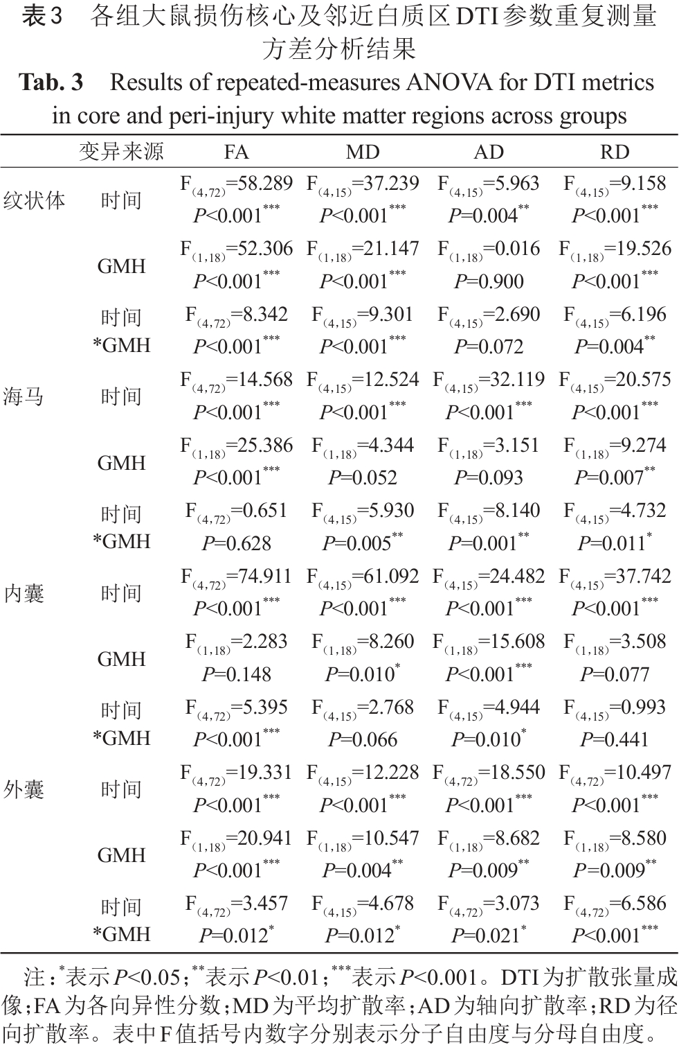 采用IBM SPSS Statistics version 27.0软件进行统计学分析处理。采用Shapiro-Wilk检验对数据进行正态性检验。符合正态分布的连续变量以x¯±s表示,两组间比较采用独立样本t检验。对损伤周边四个脑区(纹状体、海马、内囊与外囊)的DTI参数(FA、MD、AD、RD)进行重复测量方差分析,以检验时间效应、GMH效应及其交互效应。P<0.05为差异有统计学意义。