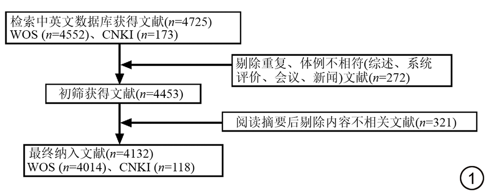 将WOS数据库中检索到的文献导入NoteExpress 3.2软件中,初步获得文献4725篇,按照纳排标准经去重后,由两名研究者独立进行标题/摘要筛查,分歧通过讨论或第三位研究者裁决,最终纳入文献4132篇,其中WOS文献4014篇,CNKI文献118篇。具体文献筛选流程见图1