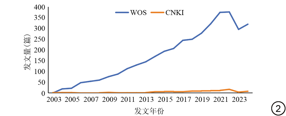 将所纳入中、英文文献分别以Refworks格式、文本格式导出并以“download_XXX.txt”形式命名,运用Excel 2019软件绘制年度发文量图,运用Citespace 6.1.R6和VOSviewer 1.6.18软件绘制可视化知识图谱。其中,VOSviewer软件对纳入文献的发文国家/地区、机构、作者、期刊进行可视化分析,Citespace软件进行关键词共现、聚类、突现分析。参数设置:Time Slicing为2003年1月至2025年9月,Years Per Slice为1,其余参数根据研究内容、图谱布局方式的不同具体设置。通常以聚类模块值(modularity, Q)和聚类轮廓值(silhouette, S)评价关键词聚类合理性和可信度,当Q>0.3、S>0.5时表示聚类结构显著、主题内文献一致性高[8]