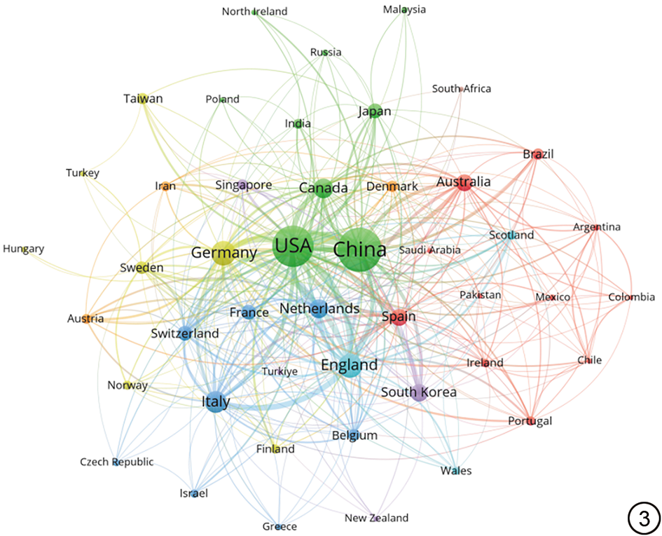 WOS纳入的4014篇文献来源于79个国家/地区(含中国台湾省),发文量排名前10位的国家/地区如表1所示。运用VOSviewer构建国家/地区合作网络,详见图3。由图、表可知,在全球范围内中国发文量居首(1684篇,41.95%,其中台湾地区发文52篇),但美国的文献被引量(74 881次)和篇均被引量(59.86次/篇)显著高于其他国家/地区;该领域的研究主要集中在欧洲、美洲、大洋洲以及东亚,国际合作网络呈现明显的集群化特征,中国、美国、加拿大构成了高发文量的核心合作集群,德国、英国、意大利虽同为高产国家,但彼此间及其与该集群尚未建立起显著的合作网络。