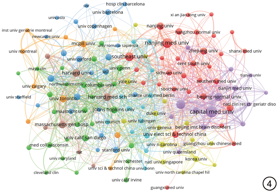 WOS中fMRI应用于MCI的相关文献共涉及3860个发文机构,CNKI共涉及200个发文机构,WOS发文量排名前10位的机构如表2所示。运用VOSviewer构建机构合作网络,见图4, 图5。由图、表可知,发文量排名前10位的机构均来自中国、美国,其中中国占据7所,首都医科大学发文量最多(213篇),但哈佛大学的文献被引量(16 887次)和篇均被引量(231.33次/篇)显著高于其他机构;机构间连线越粗代表合作越强度越大,合作网络显示,美国的合作集中于哈佛大学与其医学部及下属的麻省总医院,而中国则形成了以首都医科大学、南京医科大学为核心的国内网络,然而,中国机构与国际间的合作相对有限,且国内跨区域合作也有待加强。