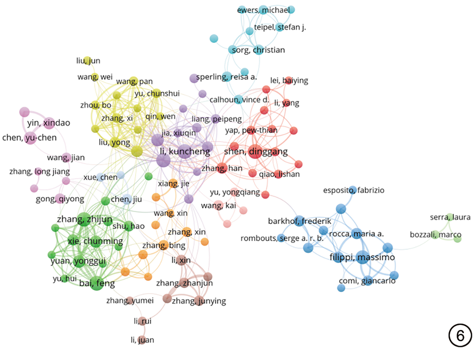 WOS中fMRI应用于MCI的相关文献共涉及19 424位发文作者,CNKI共涉及490位发文作者。根据普莱斯定律[9],M=0.749√Nmax(M为核心作者最低发文量阈值,Nmax为最高产作者的文献总量),计算得出发文量≥6篇/≥2篇的作者为该领域的核心作者,经统计符合标准的WOS/CNKI作者共有550位/62位,约占作者总数的2.83%/12.65%,尚未形成具有显著影响力的核心作者群。运用VOSviewer构建作者合作网络,见图6, 图7