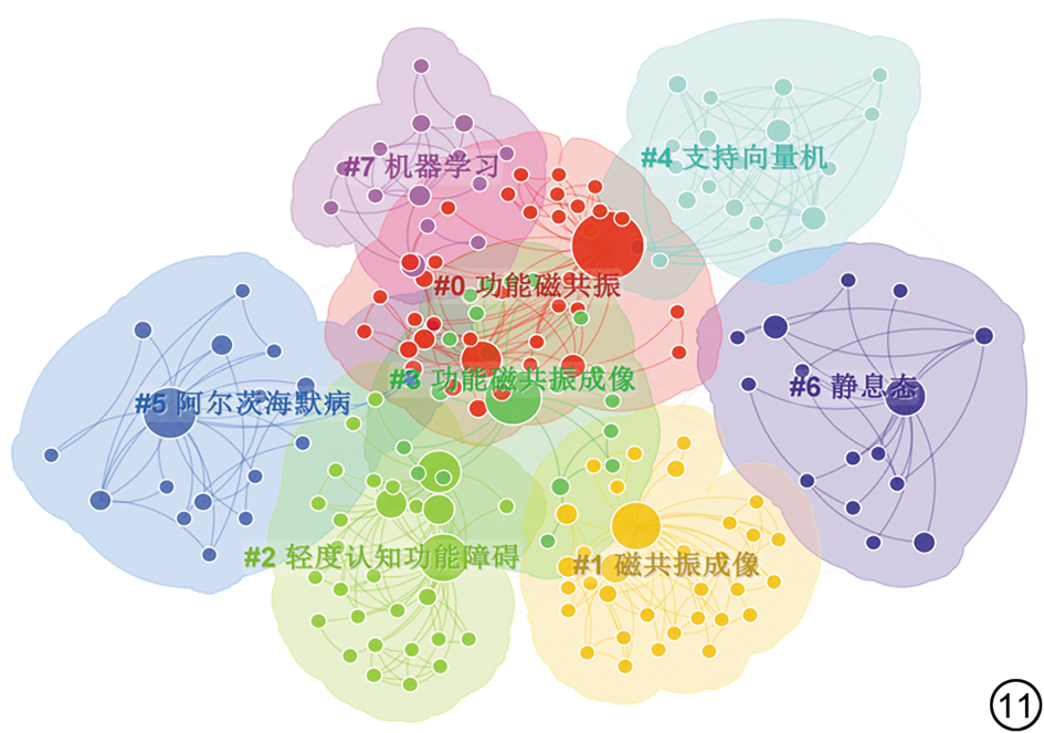 基于对数似然比算法运用Citespace对关键词进行聚类分析,见图10, 图11。本研究WOS文献聚类图谱Q=0.481、S=0.816 8,CNKI文献聚类图谱Q=0.519 4、S=0.836 1,聚类结果具有合理性。由图可知,在聚类标签中,#0 Alzheimer's disease、#3 functional MRI、#5 functional magnetic resonance imaging、#7 neuroimaging、#0 功能磁共振、#2 轻度认知功能障碍等可归纳为与研究主题相关的聚类,#1 cognition、#6 executive function为与疾病相关的认知功能评估,#2 functional connectivity、#4 支持向量机、#7 机器学习为fMRI的研究方法,#4 white matter为研究脑区。