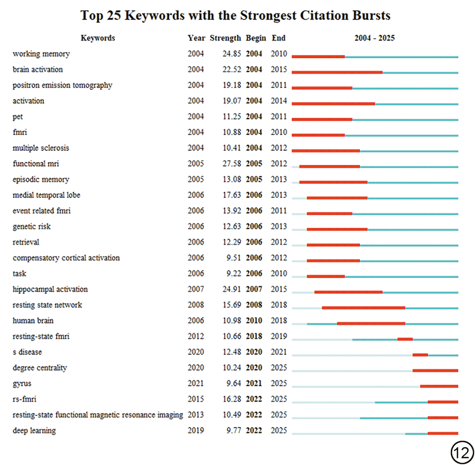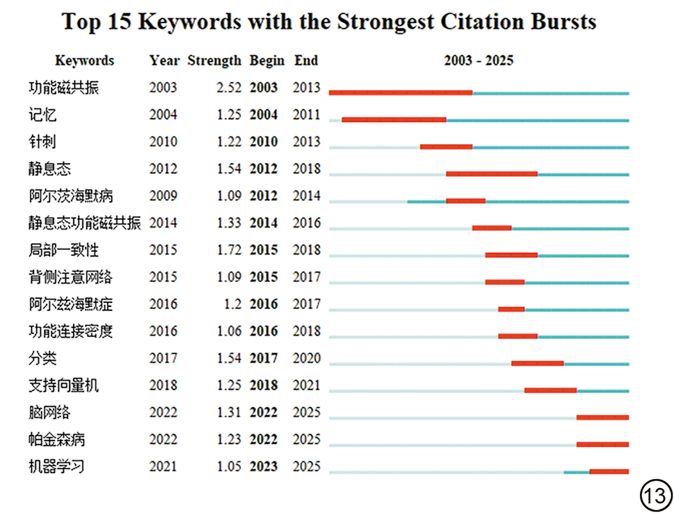 运用Citespace构建关键词突现图谱,见图12, 图13。由图可知,WOS有关fMRI应用于MCI领域的研究可概括为3个发展阶段:(1)第一阶段为2004~2007年,“working memory”“brain activation”“positron emission tomography”“activation”等关键词自2004年开始突现,“functional MRI”突现强度最高(27.58),“brain activation”持续时间最长(11年),该时段研究焦点集中在MCI患者执行特定认知任务时不同脑区的激活状态;(2)第二阶段为2008~2021年,“resting state network”突现强度最高(15.69)且持续时间最长(10年),表明静息态fMRI广泛应用于MCI研究领域,该时段研究热点从任务状态下的脑区激活,转为探索大脑内在自发活动的网络模式;(3)第三阶段为2022年至今,随着研究的进一步深入,该阶段涌现出“degree centrality”“deep learning”等关键词,该时段不仅应用图论等高阶研究工具,而且引入前沿的人工智能(如深度学习等)方法进行诊断和预测,表明fMRI应用于MCI的研究逐步走向精细化和智能化。CNKI中“脑网络”“机器学习”等关键词突现至今,成为近年来研究的热点。