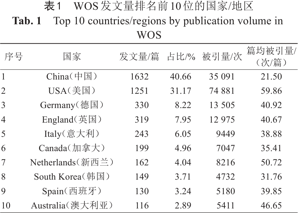 Tab. 1  Top 10 countries/regions by publication volume in WOS