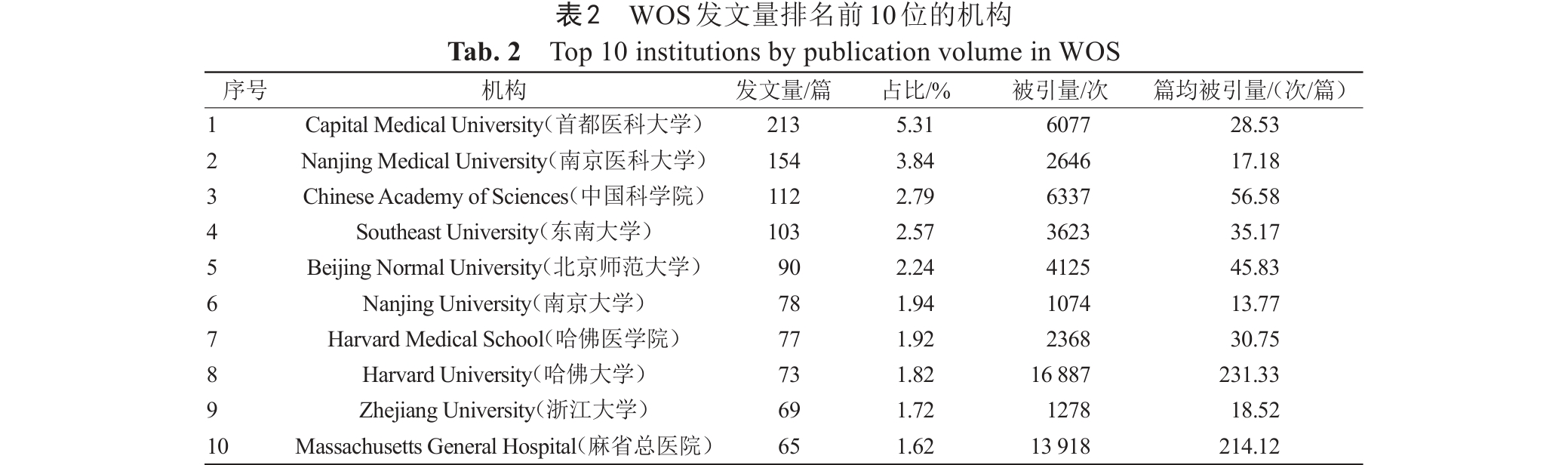 Tab. 2  Top 10 institutions by publication volume in WOS
