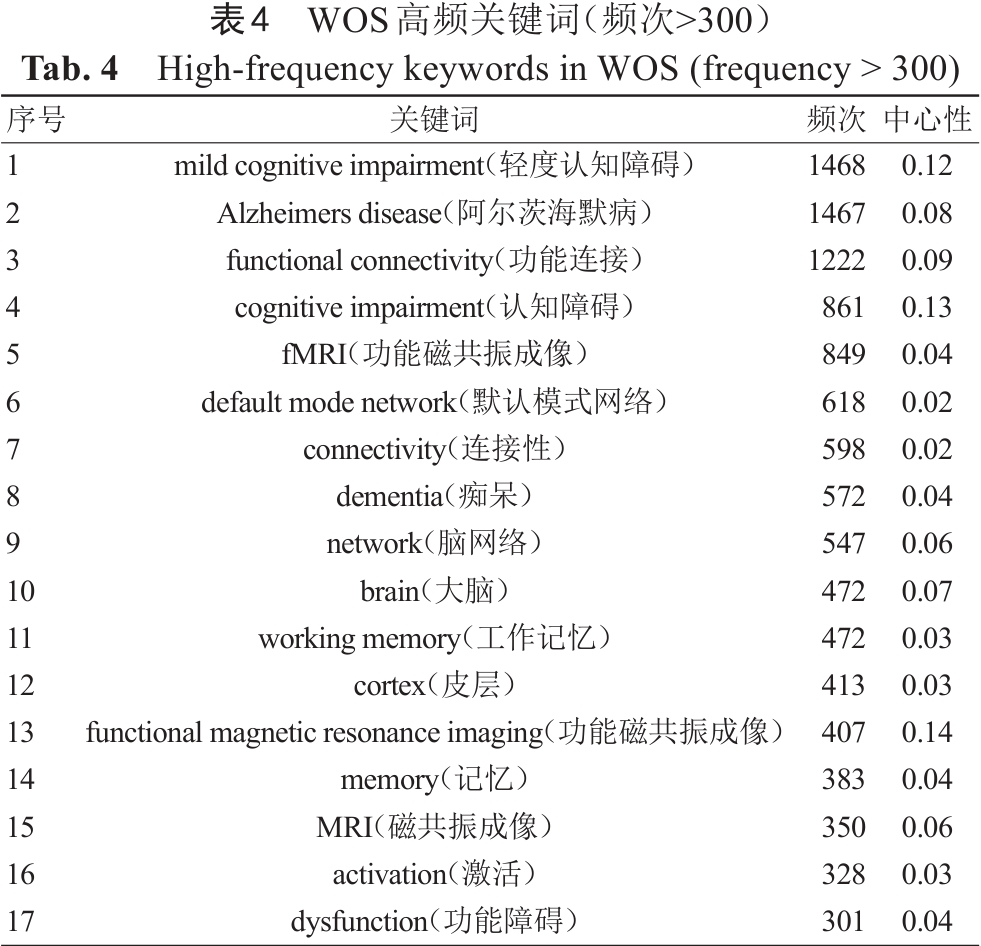 WOS中fMRI应用于MCI的相关文献共涉及9670个关键词,CNKI共涉及232个关键词,高频关键词统计信息如表4, 表5所示。运用VOSviewer构建关键词共现网络,见图8, 图9。由图、表可知,“mild cognitive impairment”“Alzheimers disease”“functional magnetic resonance imaging”“cognitive impairment”“MCI”等关键词与研究主题一致,故频次较高且中心性较强,“functional connectivity”“default mode network”“ALFF”等关键词与研究方法一致,也具有较高的频次,是该领域研究者关注的热点。