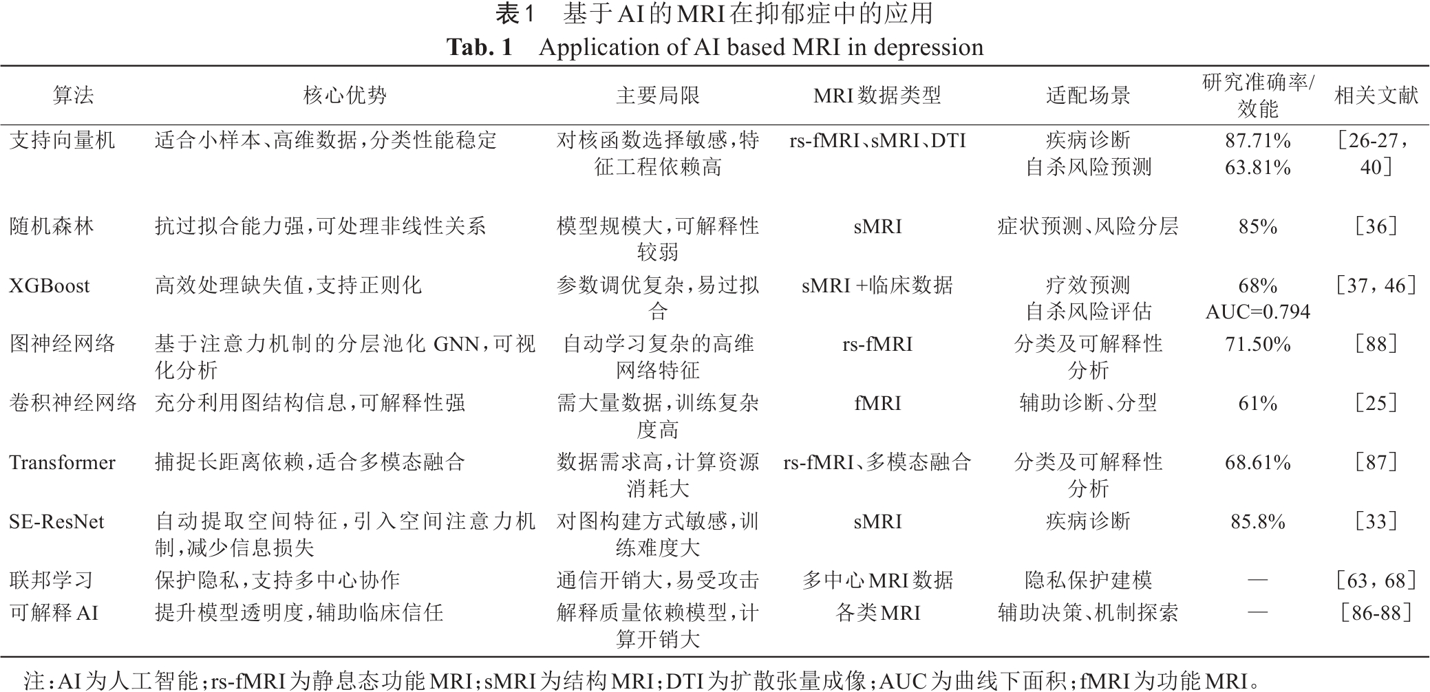 Cite this article as: LOU T, LIU Z H, ZHANG G F. Advances in the application of AI-based MRI in depressive disorder[J]. Chin J Magn Reson Imaging, 2026, 17(3): 117-124.本文引用格式:娄滔, 刘兆慧, 张高峰. 基于人工智能的MRI在抑郁症中的应用进展[J]. 磁共振成像, 2026, 17(3): 117-124. DOI:10.12015/issn.1674-8034.2026.03.017.