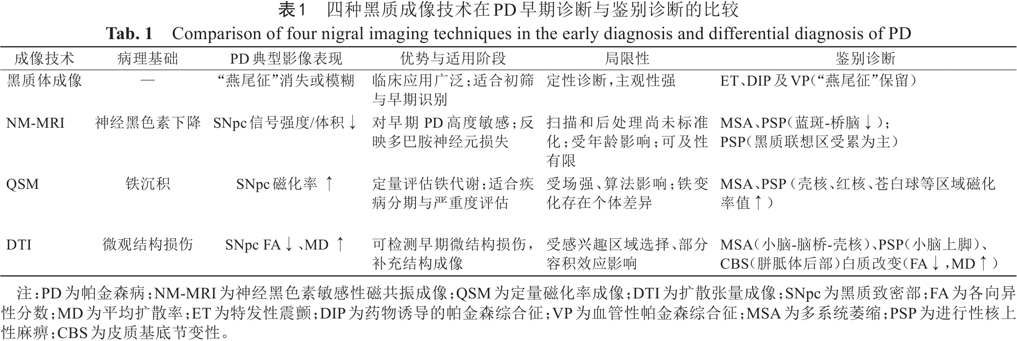 Tab. 1  Comparison of four nigral imaging techniques in the early diagnosis and differential diagnosis of PD