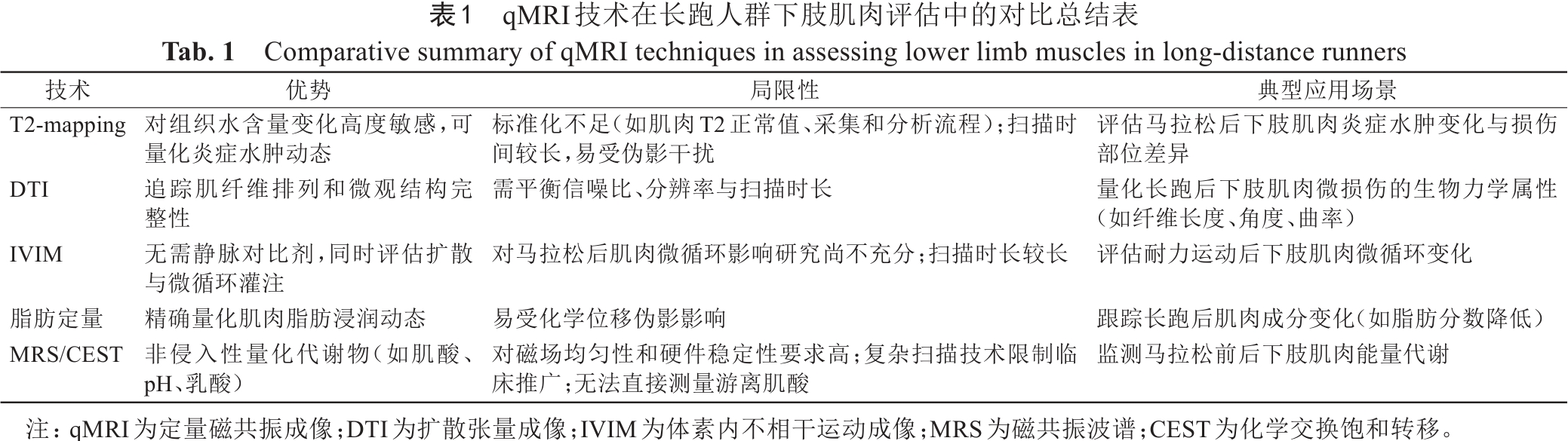 各种qMRI技术在长跑人群下肢肌肉评估中各有优势和局限,对比总结情况见表1